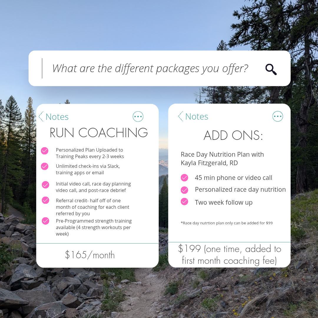 When race week approaches, we will chat to go over a plan: pacing, crewing, drop bags, nutrition, mindset, etc. I want you showing up with all bases covered! Likewise we will chat after the race to go over what went well and what maybe didn’t- so that as we continue to work together we can use those lessons learned!